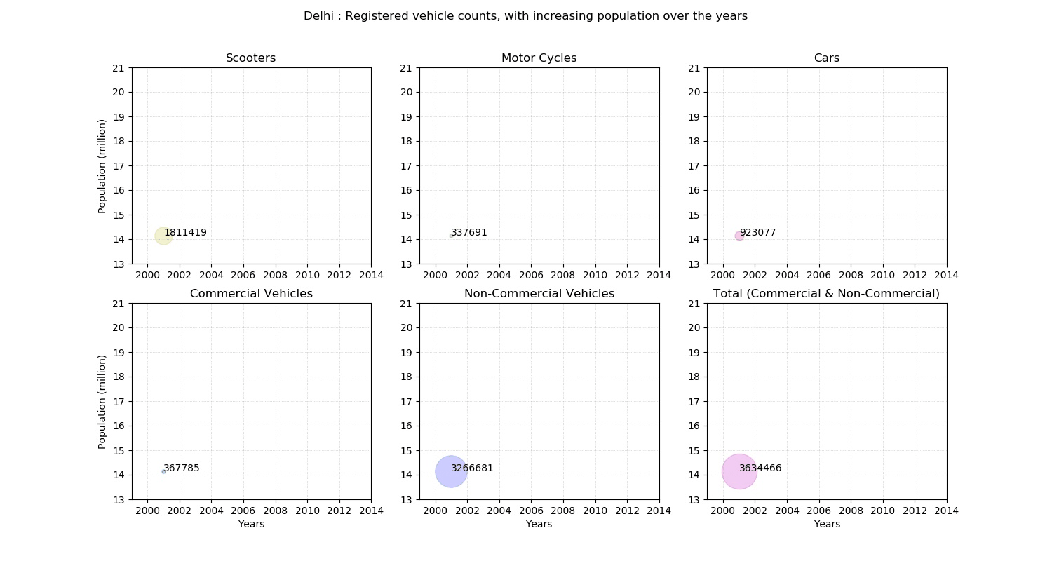 Cars slowly became famous, over the years. They were the ‘one step up’ from a scooter, for a family. Cars symbolized prosperity in a middle class family. Cars have grown from ‘one in a locality’ to ‘one per family’ in the middle class clusters of the cities. This can clearly be seen by the increase in circle size of cars, in the above visualization.